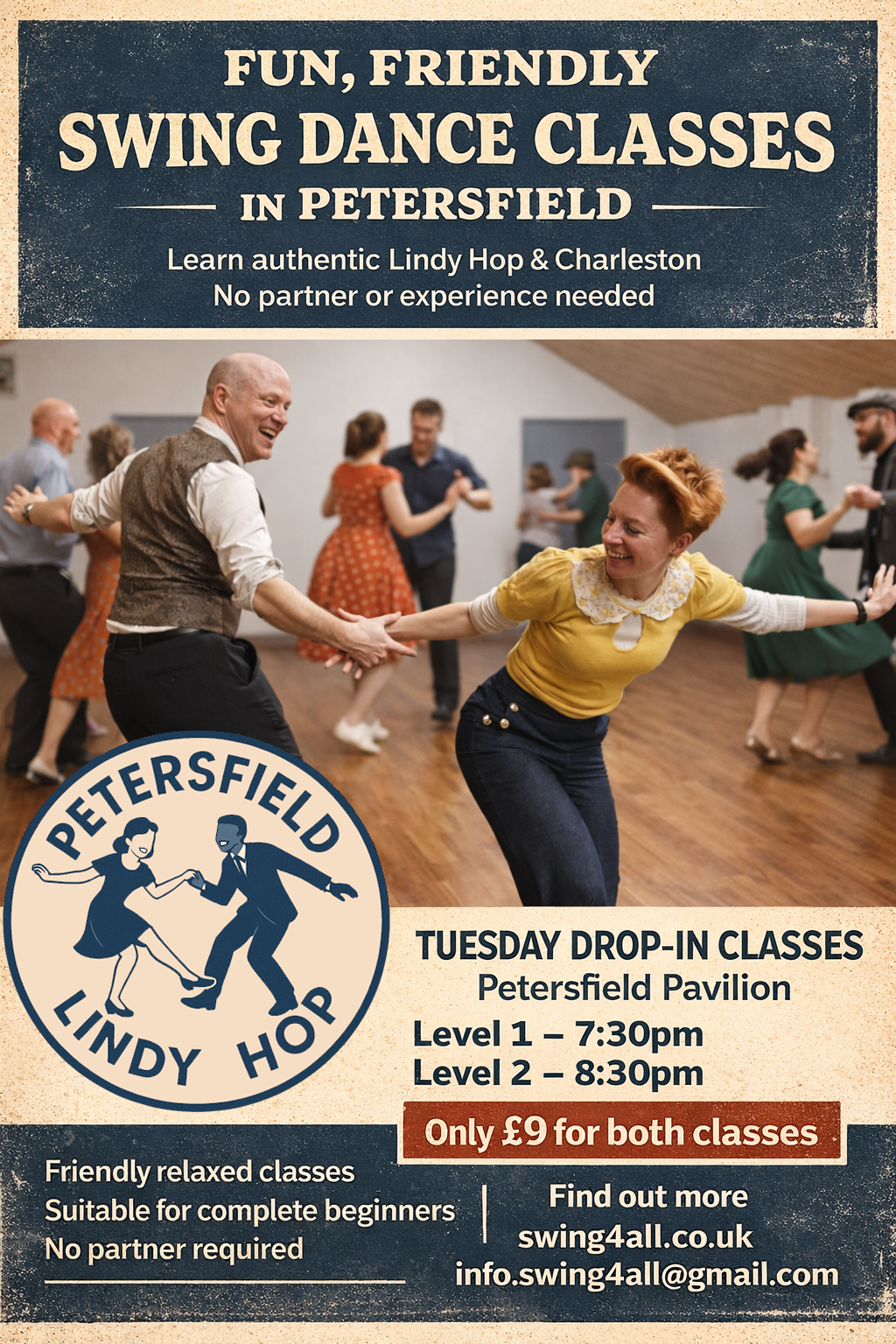 Join us for our friendly weekly Lindy Hop classes at Petersfield Pavilion! Whether you’re just starting out or looking to sharpen your moves, there’s something for everyone.